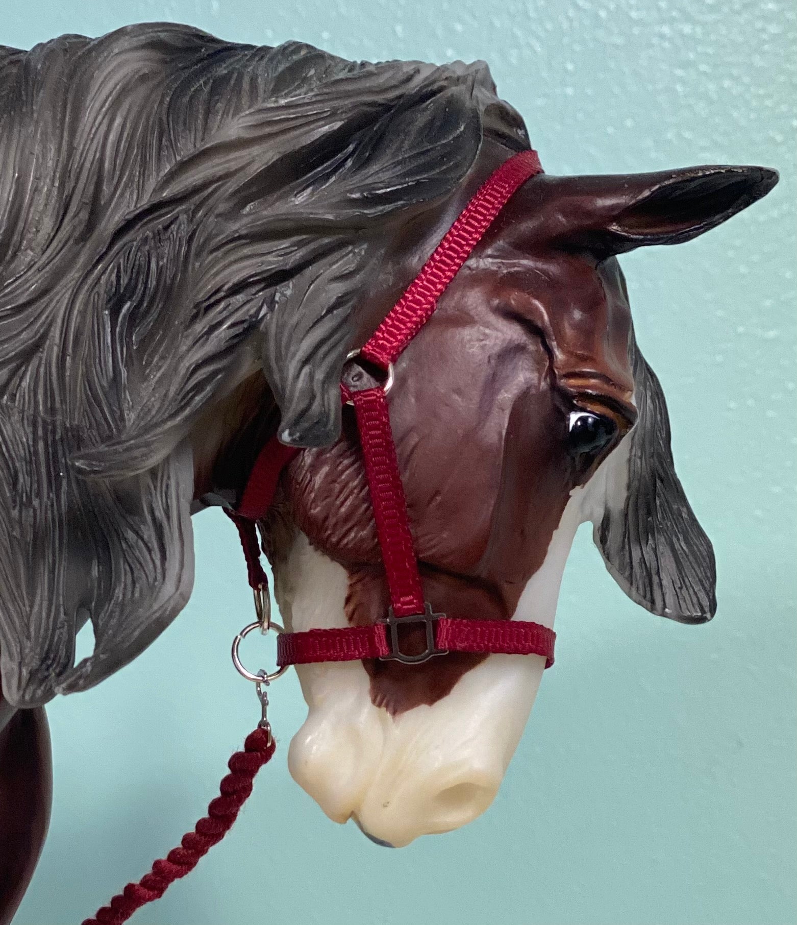 🐴 Tack up your model horses in style with this handmade halter! This maroon halter & leadrope set was made on the Breyer Othello mold, and is adjustable so it will fit most Traditional scale draft horses.